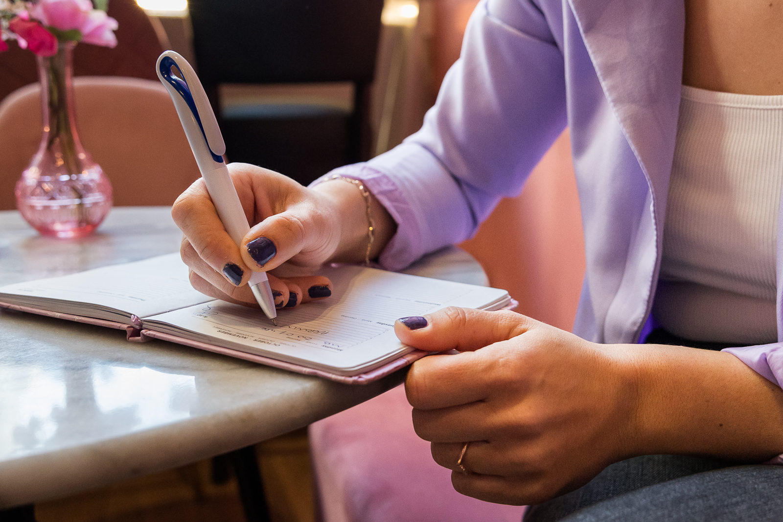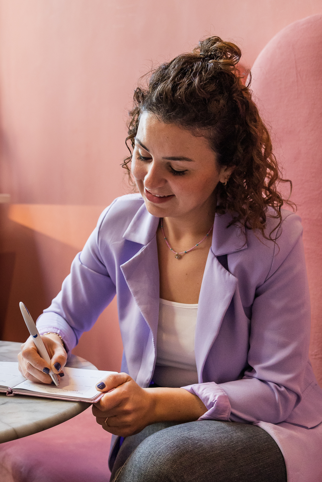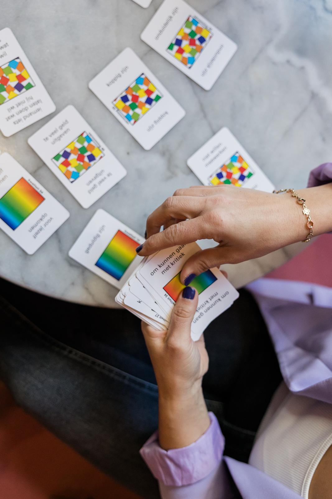 We hebben zowel portretfoto’s gemaakt als beelden waarin zij bezig is met elementen die zij gebruikt in haar werk. Denk aan haar kaartenset en momenten waarin zij aan het werk is met haar laptop of aantekeningen.