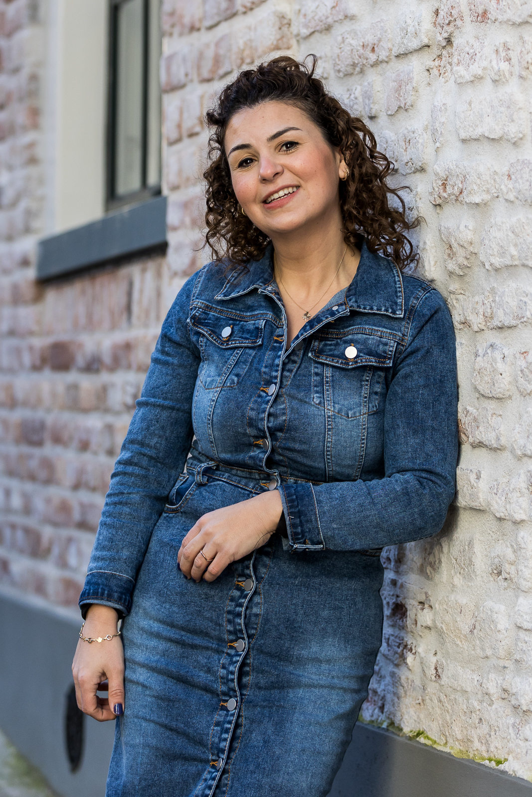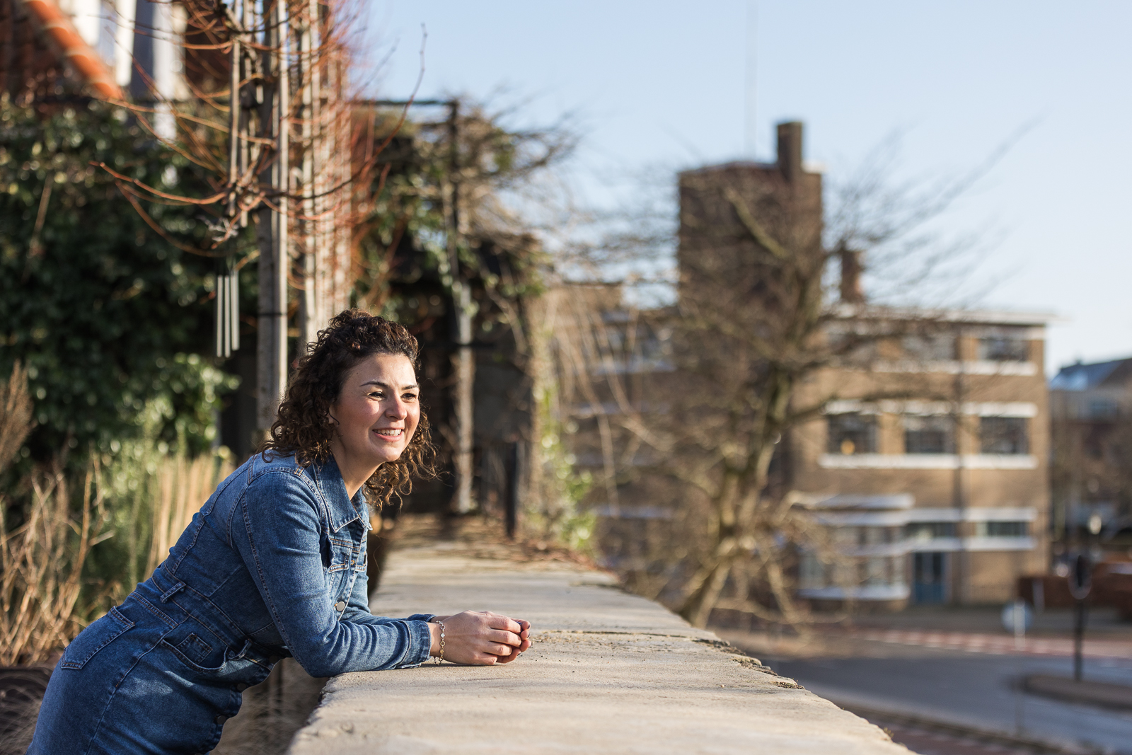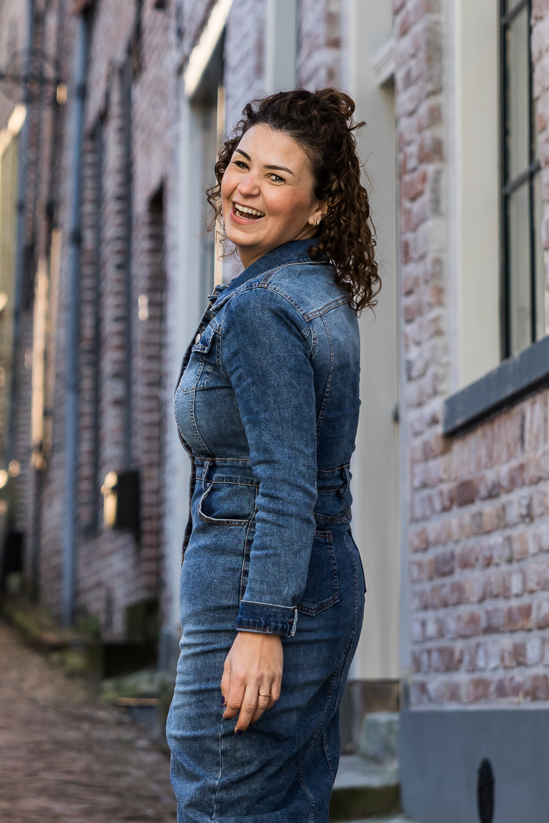 Voor deze shoot hebben we gekozen voor de binnenstad van Deventer. Deze locatie biedt veel variatie en kleur, wat goed aansluit bij haar uitstraling.